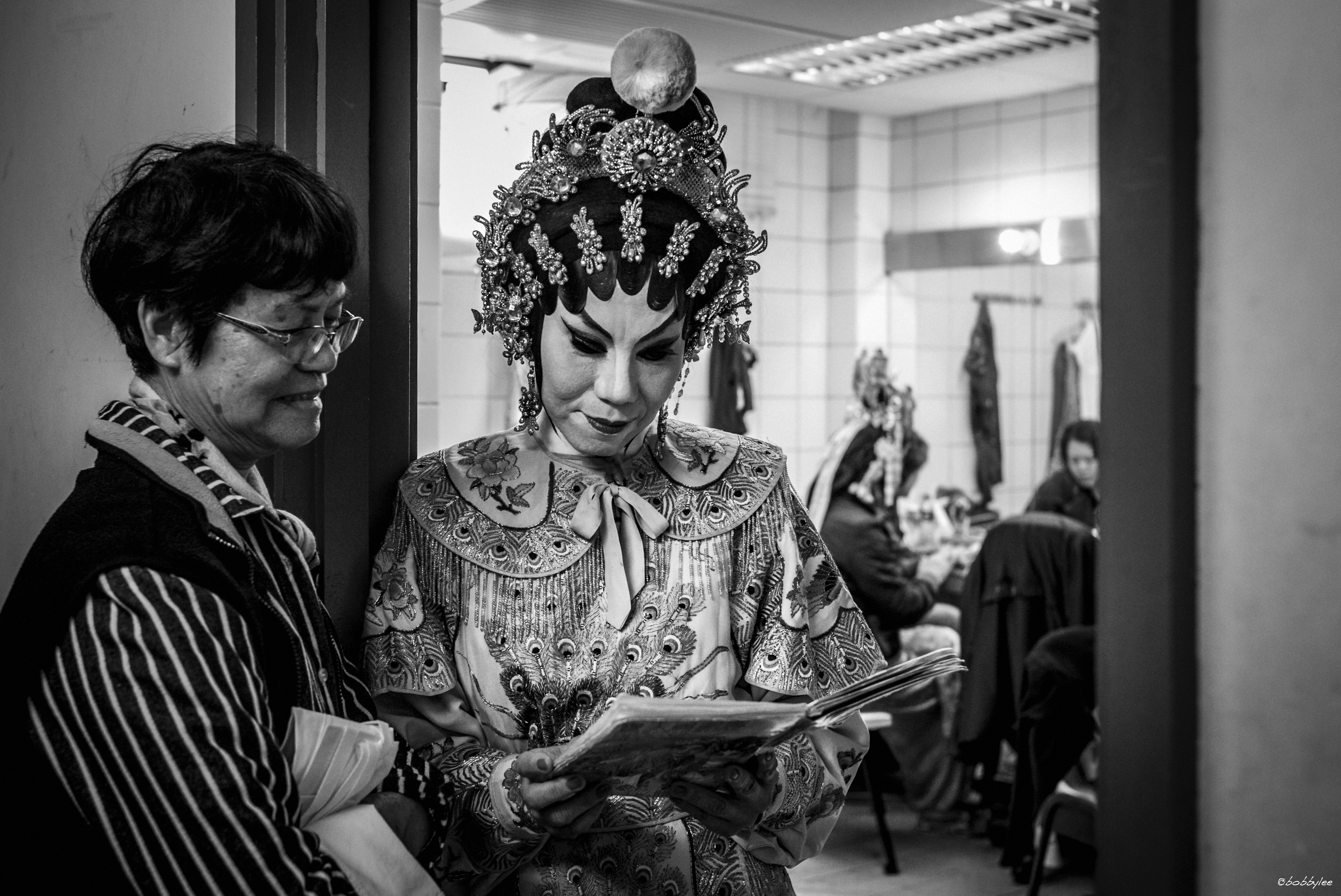正所謂台上一分鐘、台下十年功,前台固然精采,但許多人都忽略了戲班後台,「其實化妝、髮型也是表演一部分,演員的準備,化妝師的細心及專注,都是非常敬業樂業的。」拍攝時,Bobby將焦點定格在演員及化妝師的表情及手部動作,例如紮頭髮時的力度與謹慎,有時則借助透過玻璃的反射,更好地呈現化妝間的氣氛。