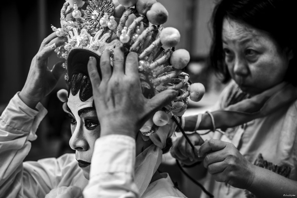 正所謂台上一分鐘、台下十年功,前台固然精采,但許多人都忽略了戲班後台,「其實化妝、髮型也是表演一部分,演員的準備,化妝師的細心及專注,都是非常敬業樂業的。」拍攝時,Bobby將焦點定格在演員及化妝師的表情及手部動作,例如紮頭髮時的力度與謹慎,有時則借助透過玻璃的反射,更好地呈現化妝間的氣氛。