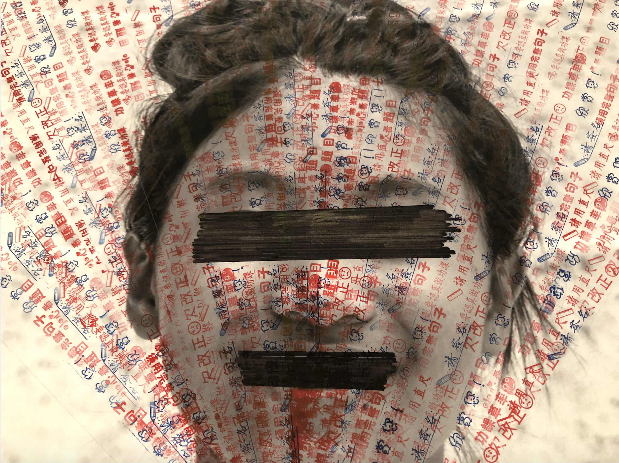 在她的作品裏,兩位女兒一步步登上高處,然而面目卻顯得模糊,伴隨的只是「欠改正」、「功課草率」、「須要用完整句子」等圖章式的評語。另外,她也邀來學童拍照,再後期處理成以練習簿遮擋他們的樣貌,象徵所謂的教育制度令他們失去自我,人人感到不開心,同時相當無助。