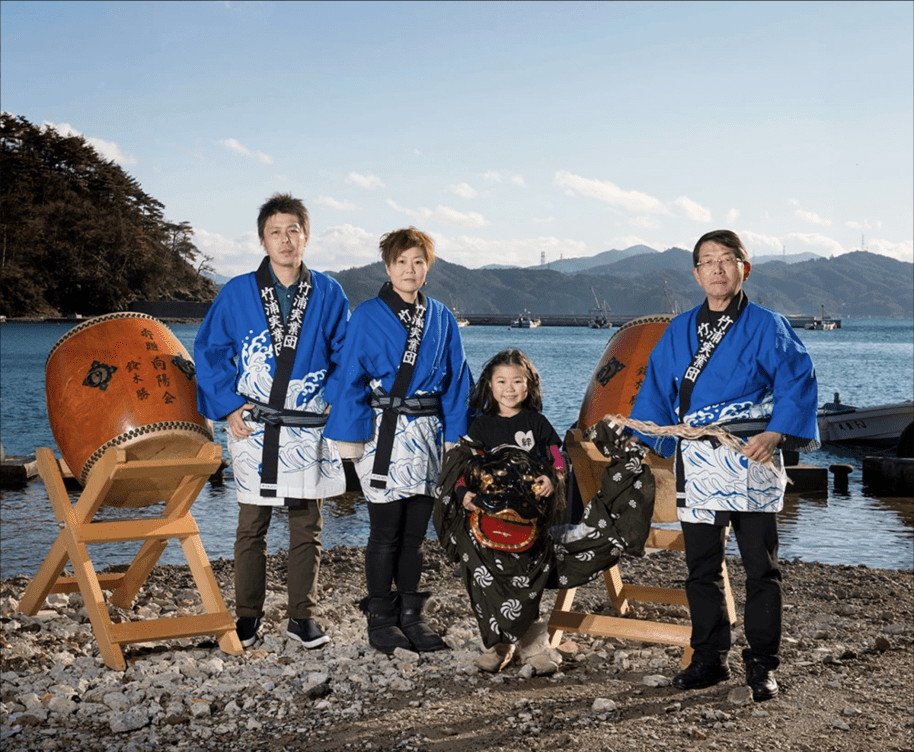 這啟發她創作《The Bonds of Parent and Child》系列,從2013年開始,拍攝接手家族生意的年輕人,父子甚至三代同堂站在家族的工場、酒樓或漁船前,有的則是繼承傳統的獅子舞及太鼓技藝。看似平凡的一組組親子組合,既體現出災後當地人如何走出陰霾,也令人感受到日本人對於傳承的重視。