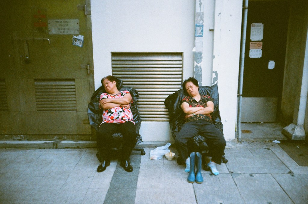 如此論調其實並不新鮮,森山大道與荒木經惟這兩位日本攝影界的泰斗,也總是忘我地不停拍攝,森山大道更視攝影是觀察城市的一種手法。對周生而言亦一樣,他本身是設計師,十多年來,他幾乎每天都會帶着Leica M6及儍瓜機,在街頭拍攝那些滑稽的瞬間。拿着手機卧睡石壆的男子、地鐵站內不經意做着相同動作的兩個陌生人、幪面超人打扮的cosplayer在海旁拍照,在太平山頂人力車做一字馬的女子……一一定格在他的菲林裏。當這些照片在攝影書裏以並排的手法呈現時,更加強了觀看時的趣味,原來「港產片」的日常也可以如斯有趣。