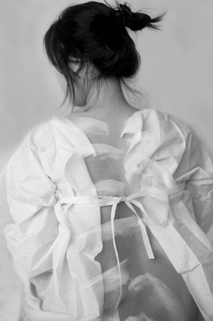 「一個人的手術室」源於她右腳的良性腫瘤,她去年做手術切除時,雖然進行局部麻醉,但仍有清楚意識。「手術長達三小時,過程非常痛苦,由於缺氧及疼痛,我幾乎暈倒。」如此難忘的經歷,啟發她一方面拍攝手術後腳背的傷疤,同時以身穿手術袍的少女,還原當時的感覺。「即使身處是同一個空間,你自己的痛,別人無法切身感受。當時護士們一直與我聊天,嘗試分散我的注意力,但這並沒轉移我的痛苦。」