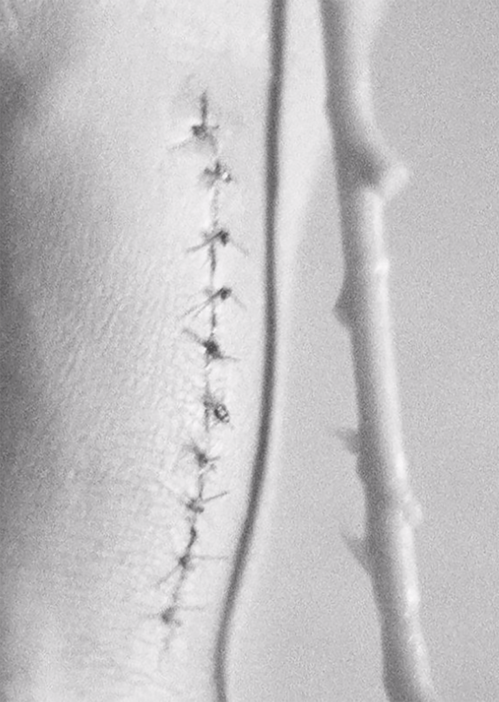 這場手術令她更肯定,每個人的苦痛只屬於自己,猶如「一個人的手術室」,誠如魯迅所說,「人類的悲歡並不相通」。她以影像呈現出這種領悟,雖然手術過程百般痛苦,然而呈現出來的影像卻是柔和而平靜的。踏入展覽現場,目光被地上的照片裝置作品吸引,偌大的傷疤照片浸泡在水中,赤裸裸的傷痕在花瓣的襯托下,竟有一種淡然的美感。「花瓣猶如皮膚,它的分解好像切開腳背之後取走腫瘤,模仿在手術台上的感覺。 」