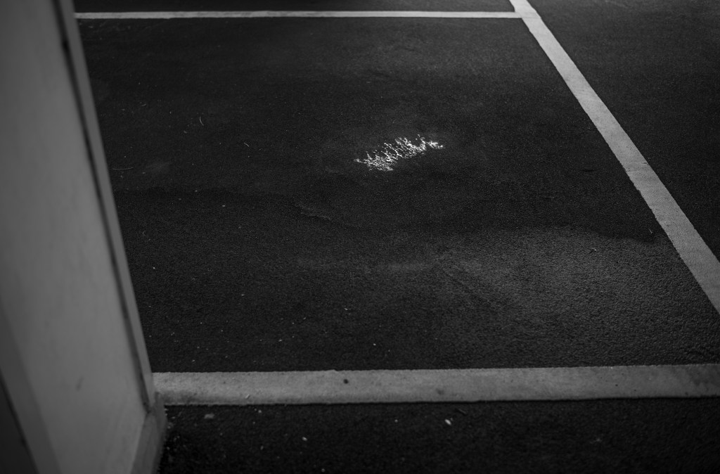 他的照片不乏大家熟悉的地方,例如街頭的金屬告示牌、透明玻璃折射的不真實風景,又或是地面上的油迹,只是越是熟悉的地方,就越容易被忽略。在另一幅作品《25222018》中,地面發光的油迹吸引人的目光,彷彿拉近與觀者的視覺距離。「平面的空間有遠近,油迹雖然位於空間的遠處,但發光的物件在人們的視覺心理上反而較近,營造出一種空間上的錯覺。」