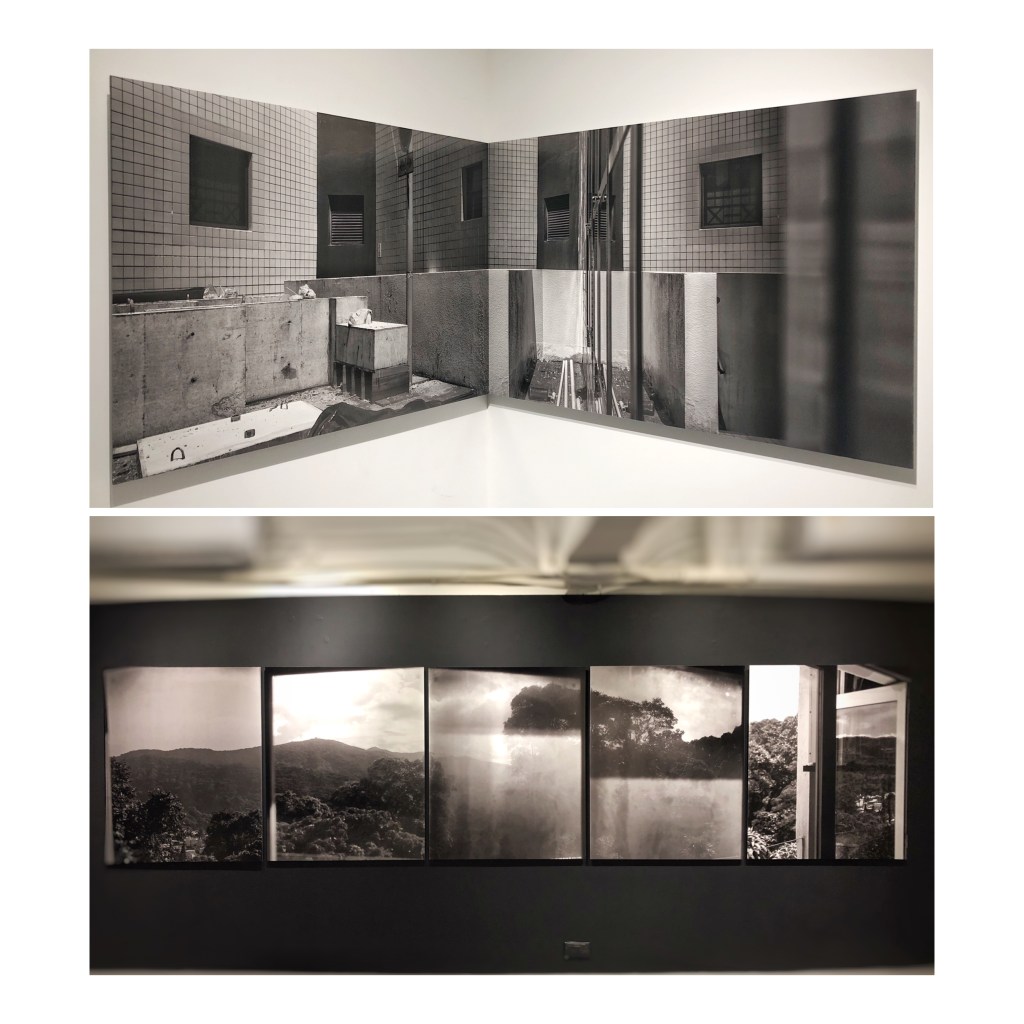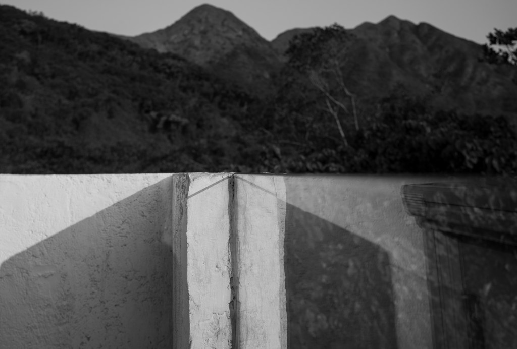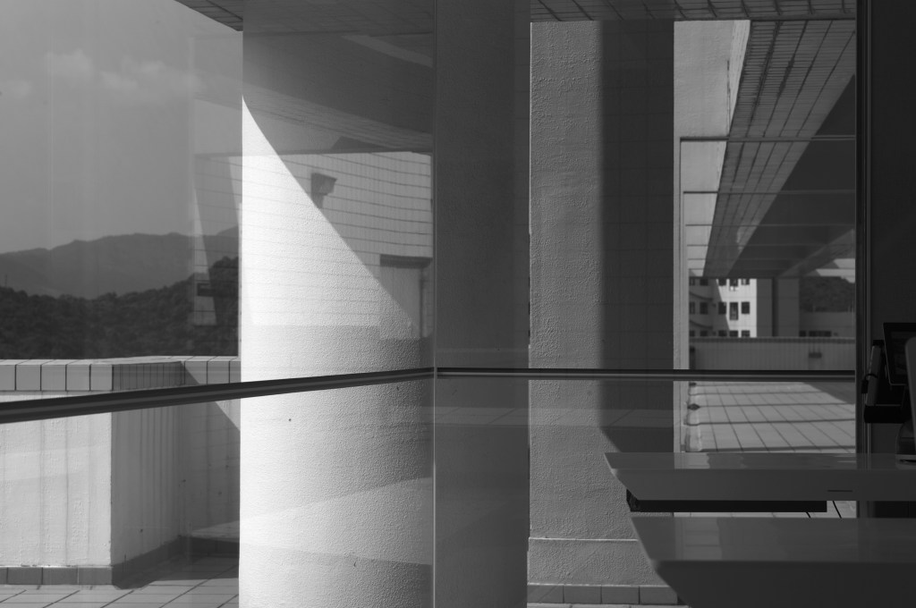 在這些沒有導向性的相片中,其實也能窺看出他對建築空間及構圖取捨的有趣之處。例如在照片《78462020》中,前景的石牆與遠景的山峯正好被中間的橫直線條切割,彷彿由兩張不同物理空間的影像拼貼而成。仔細留意中間的直線,部份是由白色牆角玻璃反射的影像構成,產生一種虛實結合的畫面。 他巧妙地利用精準構圖及透視元素,透過相機的觀景器聚焦外界空間,嘗試在尋常的風景中呈現出全新的觀看角度,藉此挑戰空間的物理限制。