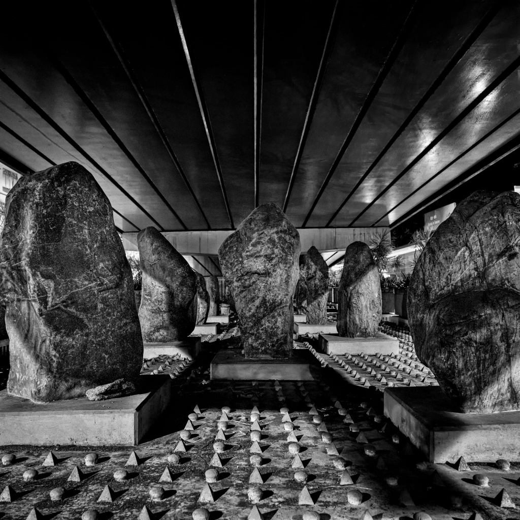 在攝影集中,周浩文將天橋底下的內容分為數個章節,第一部份是天橋底空間的整體環境,例如中環夏愨道天橋下三尖八角的石陣、油麻地渡船街天橋底的蛋型石頭、九龍城世運花園天橋下的圓柱及四角錐形的水泥磚塊,錐形石塊也令周浩文拍攝時難免擔心,「害怕不小心踏錯腳會釀成意外。」荔枝角寶輪街停車場天橋底是電影《濁水漂流》的拍攝地,那凹凸不平的地面以及傾斜的矮石牆,不知情的人或以為是裝置藝術,這些為人們帶來不便的建築物以及非人性化的空間設計,也明顯是為趕走露宿者。「最離奇的是,觀塘道天橋底是繁忙的馬路,平時並沒有人露宿,也有很多大石頭,這讓我摸不著頭腦。」