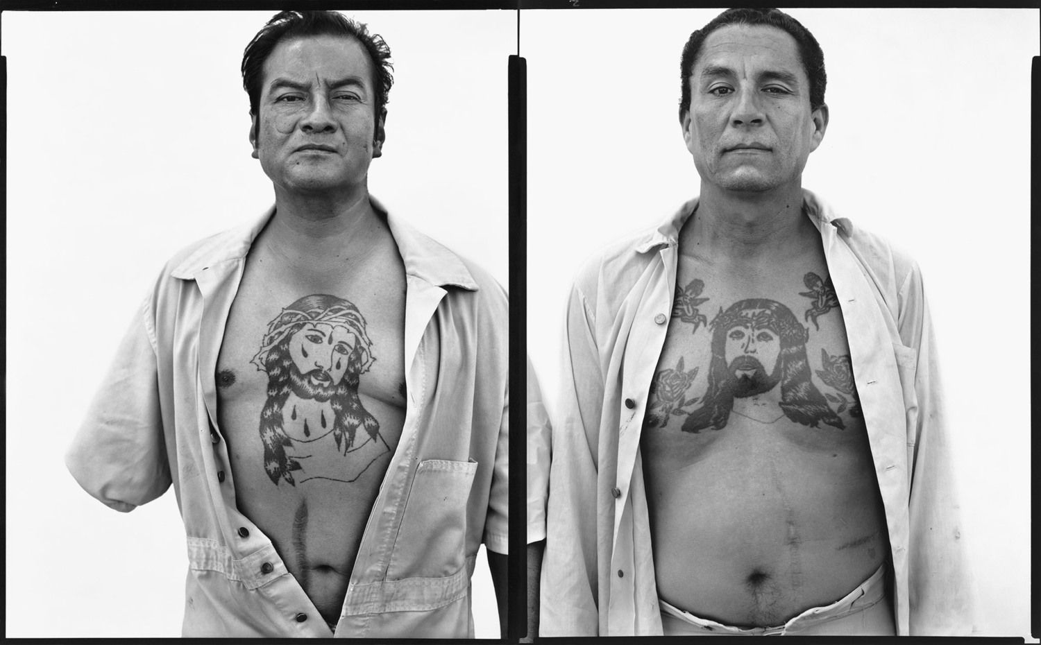 Richard Avedon鏡頭下的人物,均是平凡無奇的西部人,以及那些被世人忽視的人們,油田及屠宰場工人、礦工、搬運工人、新墨西哥州精神病院病人。在德州聖安東尼奧拍攝紋身師時,他們得知最好的紋身師均在監獄裏面,於是千辛萬苦取得許可進入監獄拍攝。裏面的犯人大多是墨西哥裔人,他們的紋身總與宗教信仰相關,攝影團隊發現身處兩位不同牢房的犯人,他們互不相識,然而他們的身高、背景甚至紋身均很相似,於是他們將兩幅相片並置,創作成一幅「雙聯畫」。