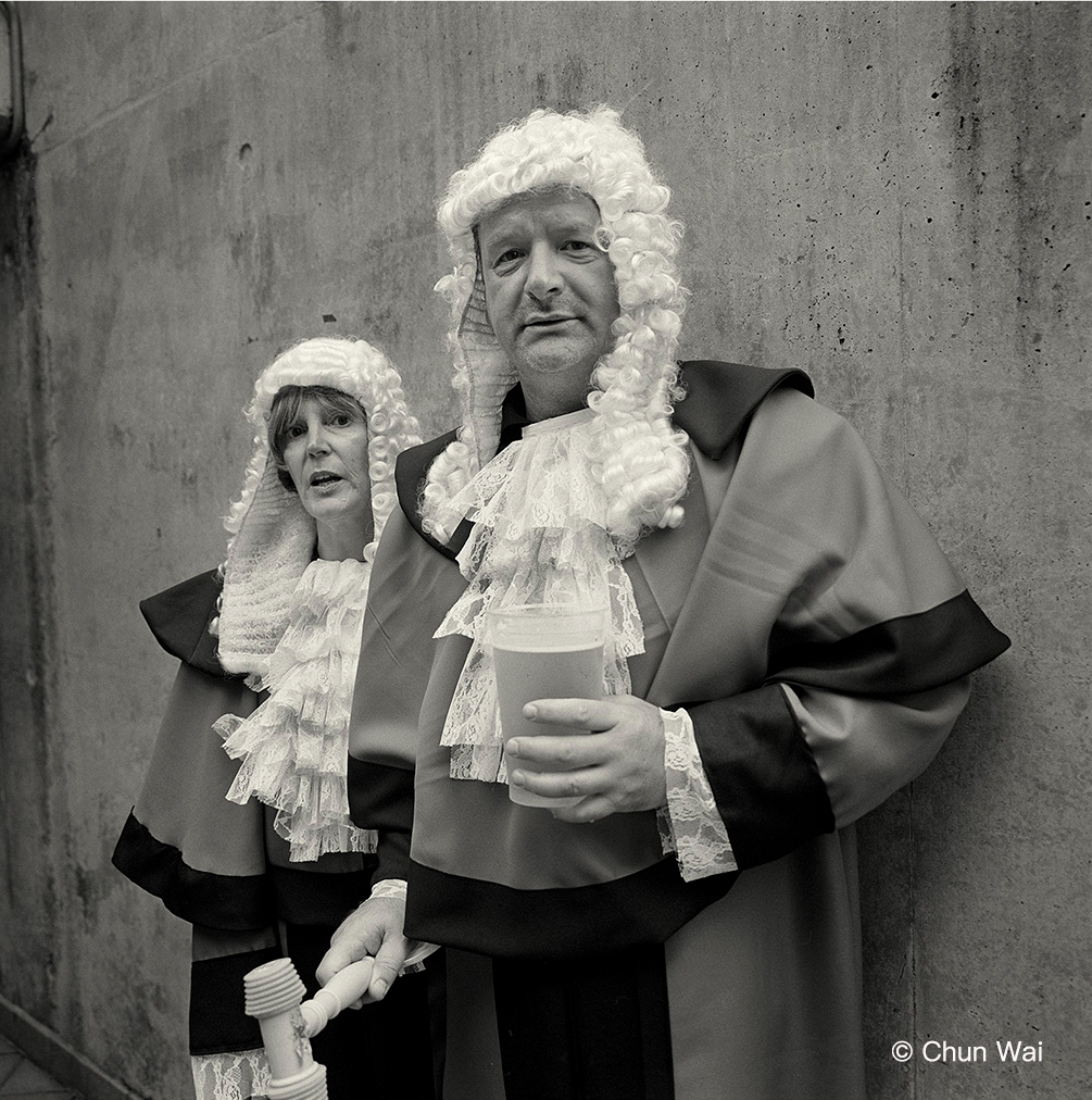 作為一項男性運動,香港國際七人欖球賽的球迷也以男性為主,從秦偉所拍攝的人物中,也可見一斑。男士們刻意來個性別轉換,變身天使、護士、白雪公主、夏威夷女郎、修女等角色,形象滑稽卻不失幽默感。觀眾的造型固然反映個人喜好,有時也可見當時流行的因素,一位球迷特意以特朗普的造型扮相,可謂不言而喻。有時也「穿者無意,觀者有心」,一幅外籍法官的照片容易引起目光,司法制度曾是香港引以為傲的基石,現在回看卻有幾分感慨。這些包羅萬象的角色或造型,是人們在打破日常枷鎖後,無聲演繹出不同的聲音。