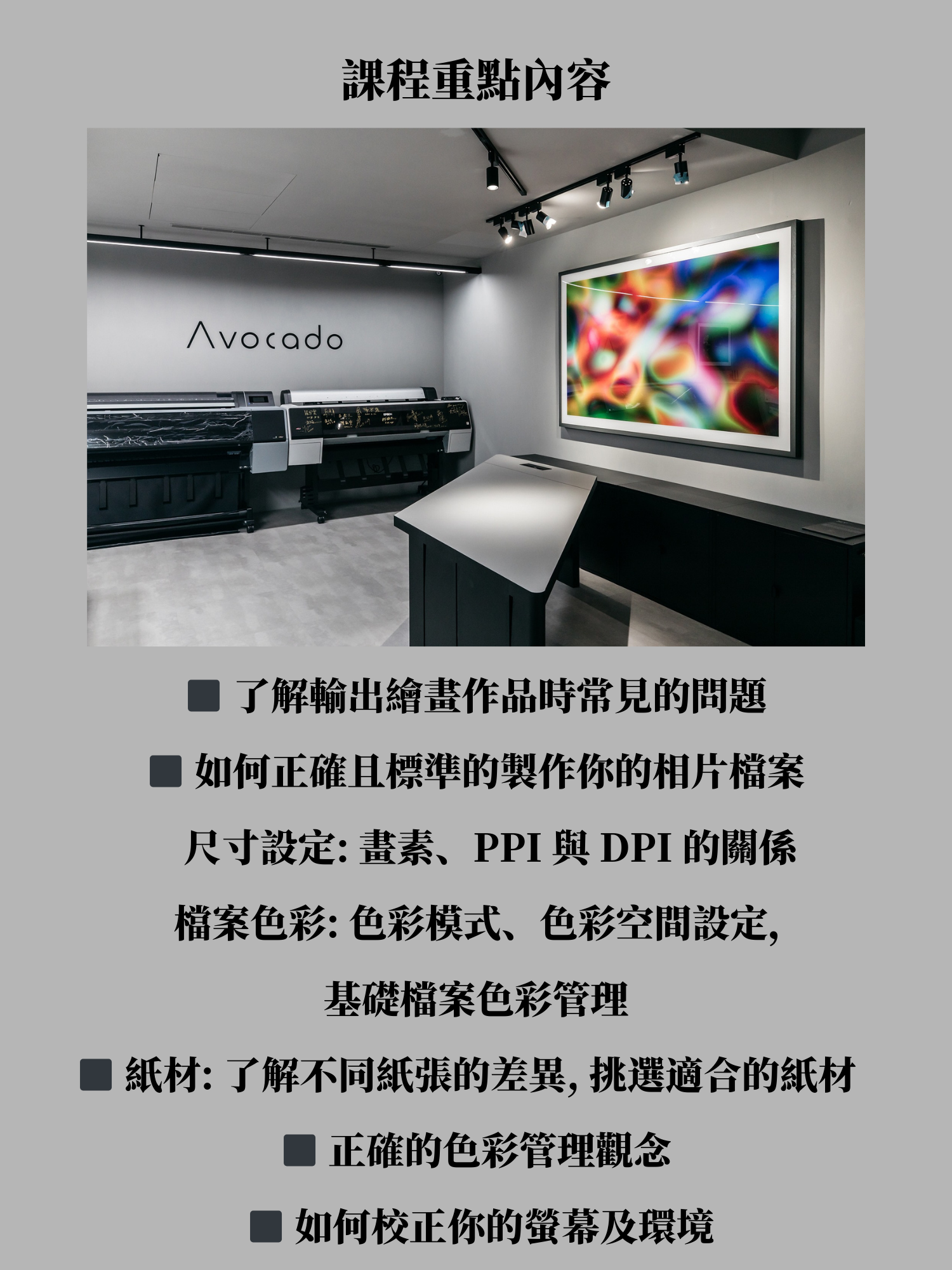 由台灣首屈一指的藝術微噴輸出中心Avocado Art Lab 與 香港攝影書店 顯影堂 聯合主辦的 「給插畫家的藝術微噴與色彩管理通識課」,將由Avocado創辦人Kenny賴致維親自授課,以深入淺出的方式帶領大家認識繪畫創作者必須掌握的「藝術微噴與色彩管理」關鍵知識,同時以插畫創作中最常使用的 Photoshop與Procreate為例,實際示範如何設定檔案,確保畫質與色彩達到最佳狀態,帶你快速掌握製作高品質數碼檔案與高階輸出的重要觀念,讓作品在任何媒介中都能忠實呈現。