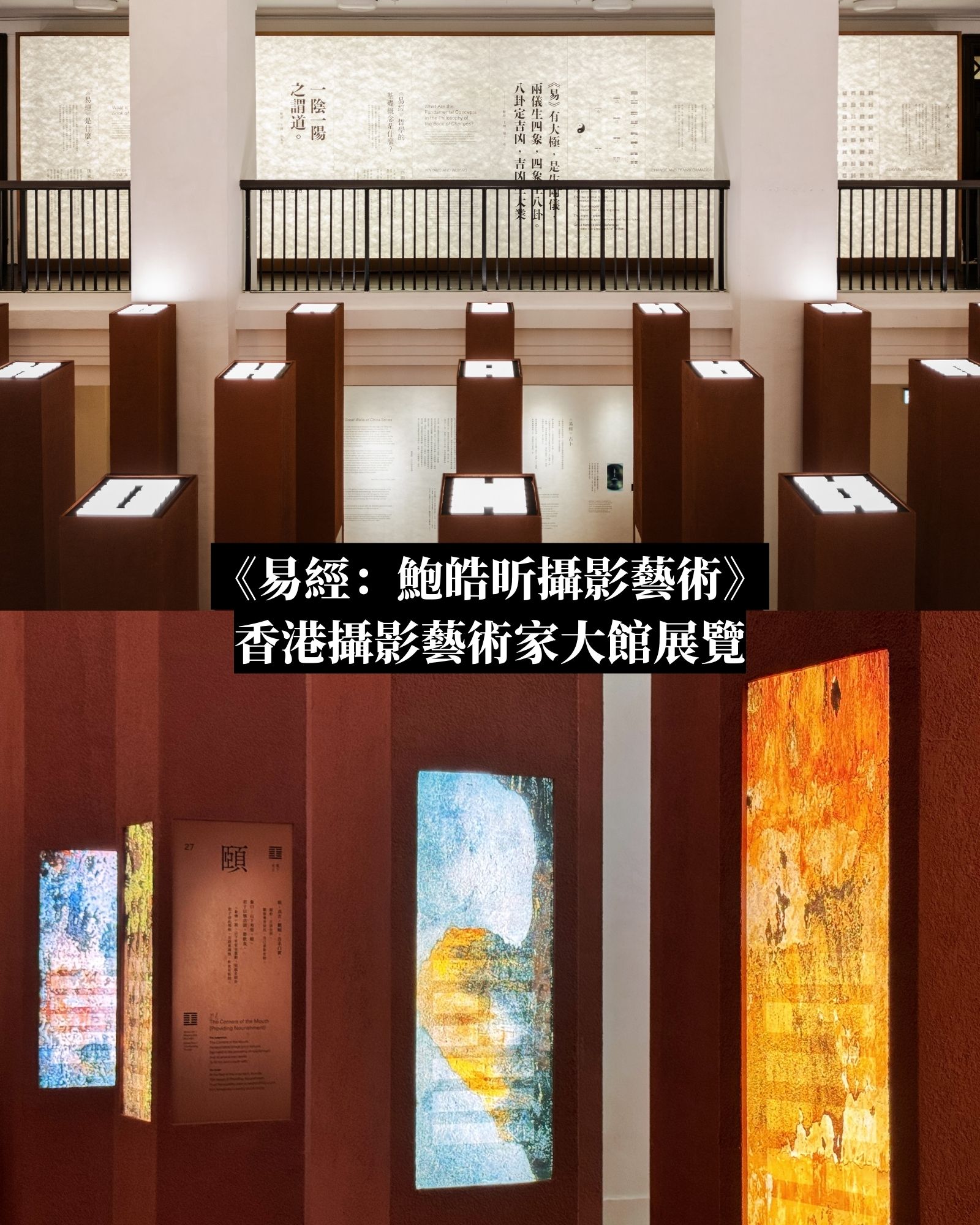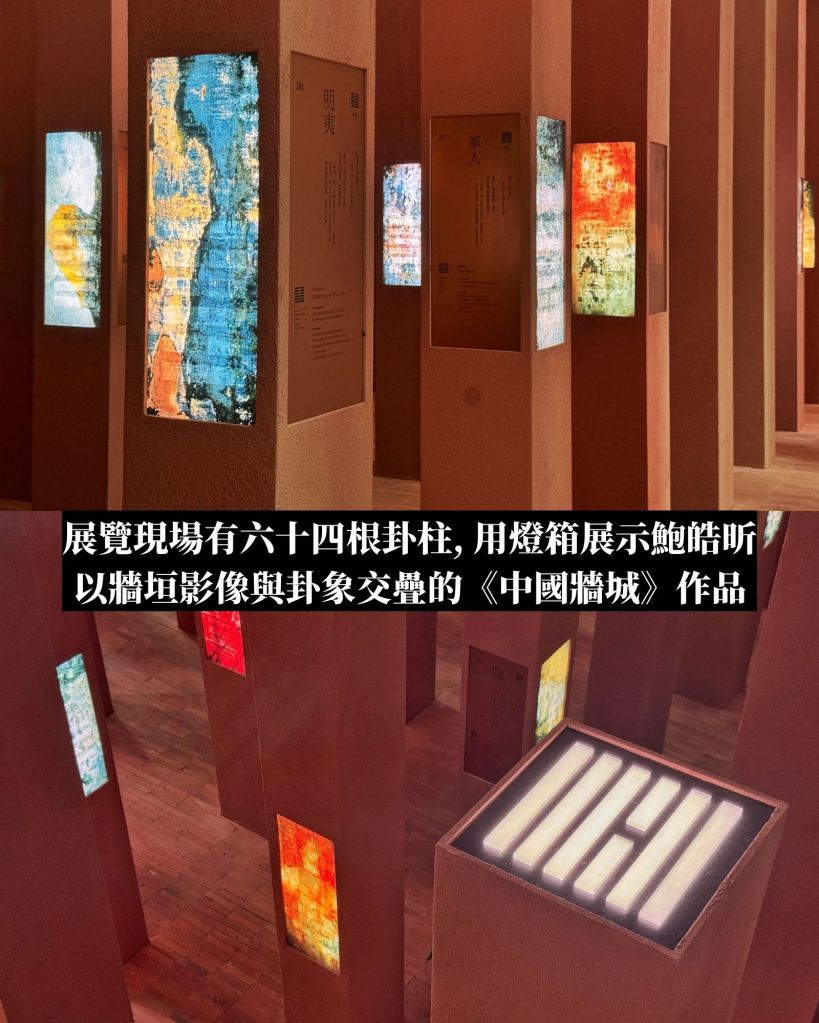 來到地面展廳,很自然被迎面而來的卦柱森林吸引,整個展場被六十四根柱體分割,每根柱子代表一個卦象,以燈箱展示一幅鮑皓昕的《中國牆城》作品,將斑駁的牆垣影像與《易經》六十四卦的符號交疊,以當代視覺形式呼應著古代哲學思想。