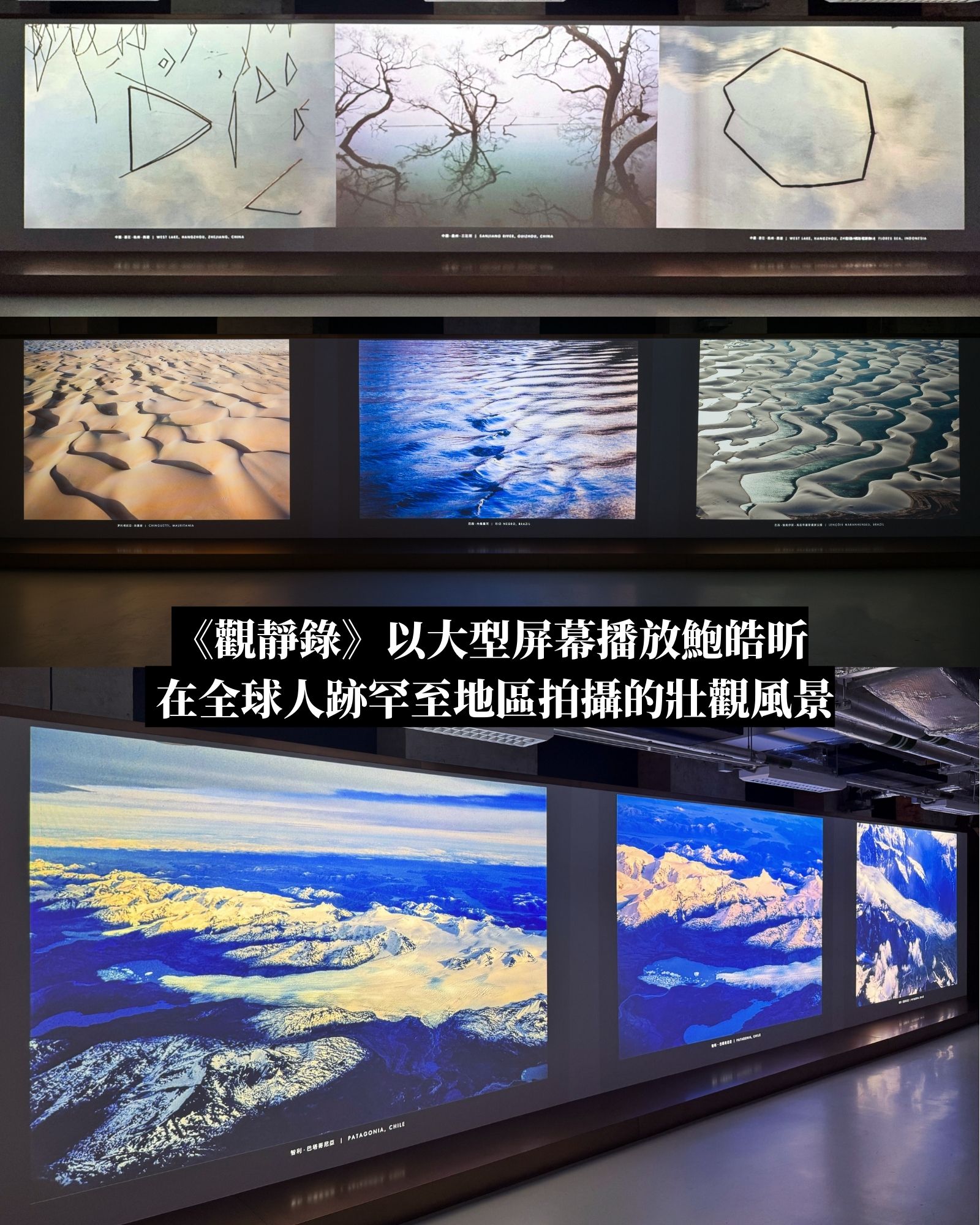 展覽第一部分是《觀靜錄》,巨大屏幕播放鮑皓昕過去四十年在世界各地拍攝的大自然風景。從雪山、沙漠到海洋,畫面節奏緩慢但非常壯麗,讓人不由自主停下腳步慢慢欣賞。在那個無人機尚未普及的年代,如此壯觀風景是鮑皓昕身處直昇機所拍攝,每幅作品均得來不易,攝影師想藉此詮釋《易經》中「天人合一」的概念。