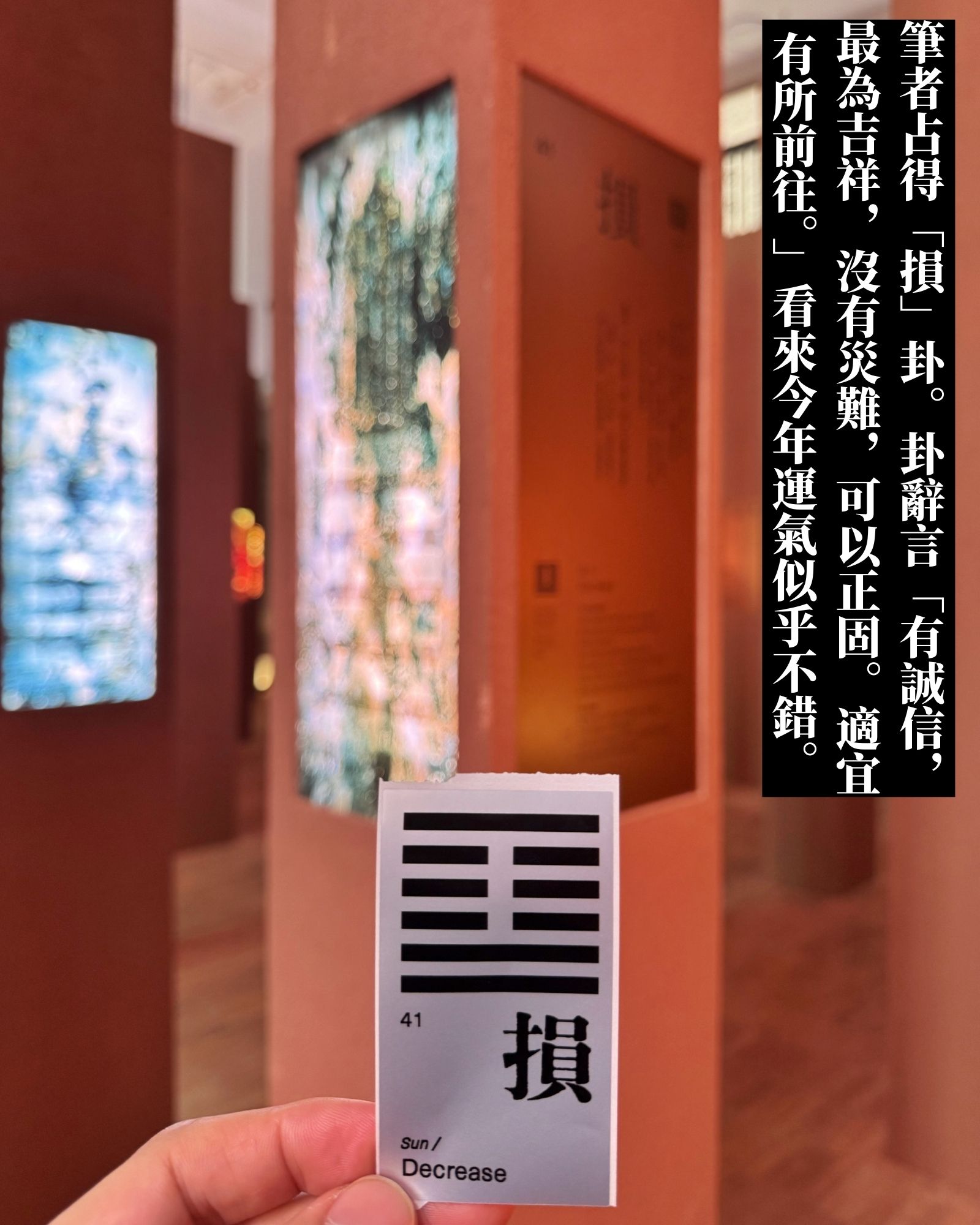 在進入卦柱森林前,我根據展區旁的指示卜卦,結果占得第四十一卦「損」,起初我以為這是不祥之兆,隨即來到相應的卦柱,看到柱上的卦辭寫著「有誠信,最為吉祥,沒有災難,可以正固。適宜有所前往。」那一刻,我忽然覺得卦辭彷彿對我說:凡事不要只看表面,今年的運勢似乎不錯,應該懷著誠心前行。