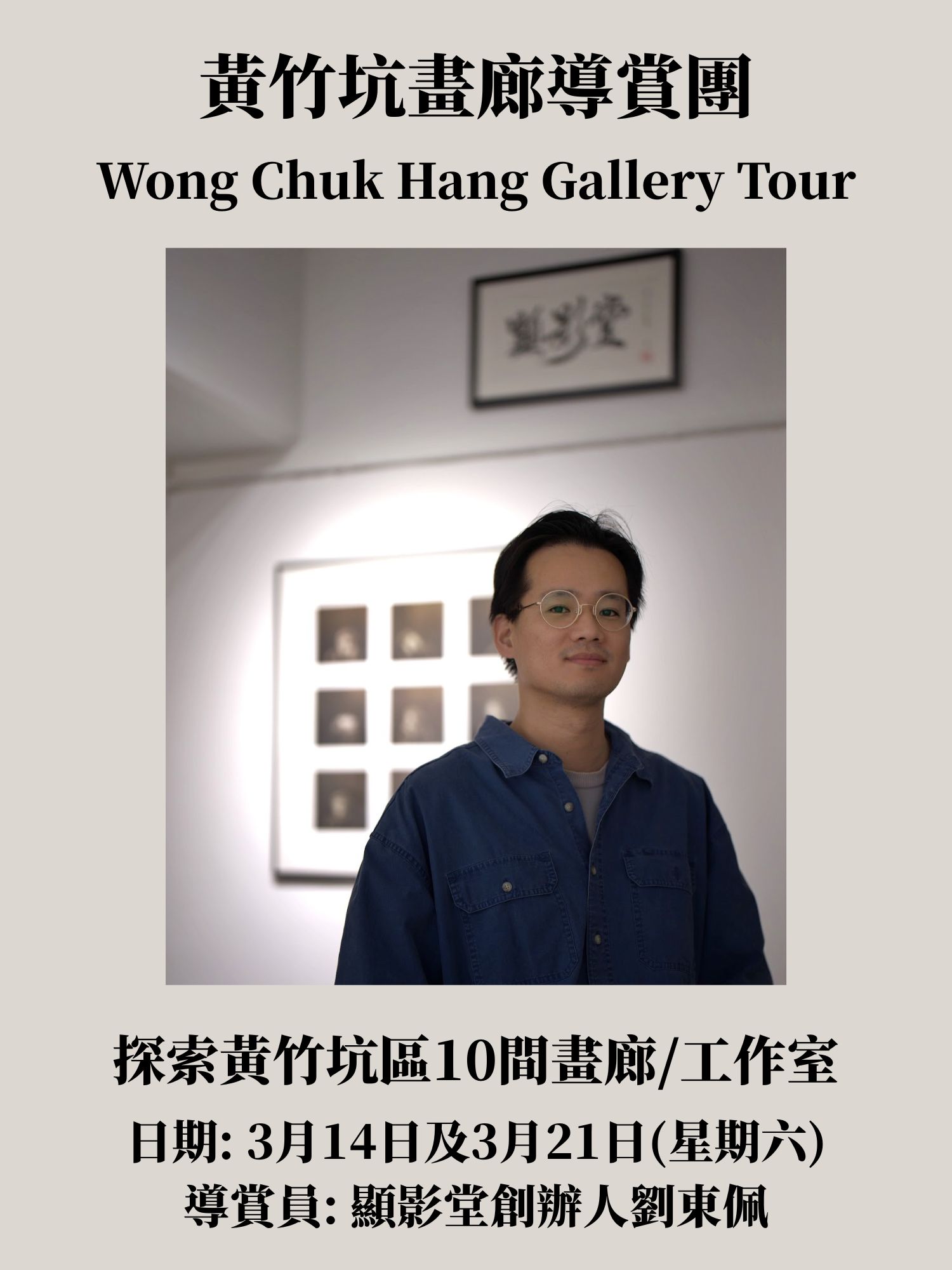 由曾任藝文版記者多年的顯影堂創辦人劉東佩擔任導賞員,「黃竹坑畫廊之旅」將探訪那些隱藏在工廈中的藝術空間,由導覽員親自講解每間畫廊的歷史及定位,以及藝術品背後的構思與故事,並有機會與藝術家或畫廊代表即場對話。