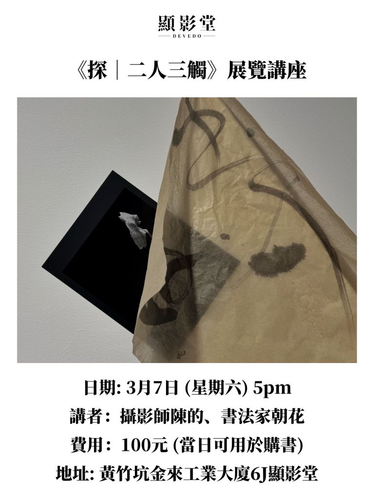香港攝影書店空間「顯影堂」展覽《探|二人三觸》延長至3月14日,呈現香港攝影家陳的和書法家朝花(三三)的作品。陳的透過影像去「觸摸」內在身體空間,而三三書法則以紙張的質地象徵「身體的皮膚」。