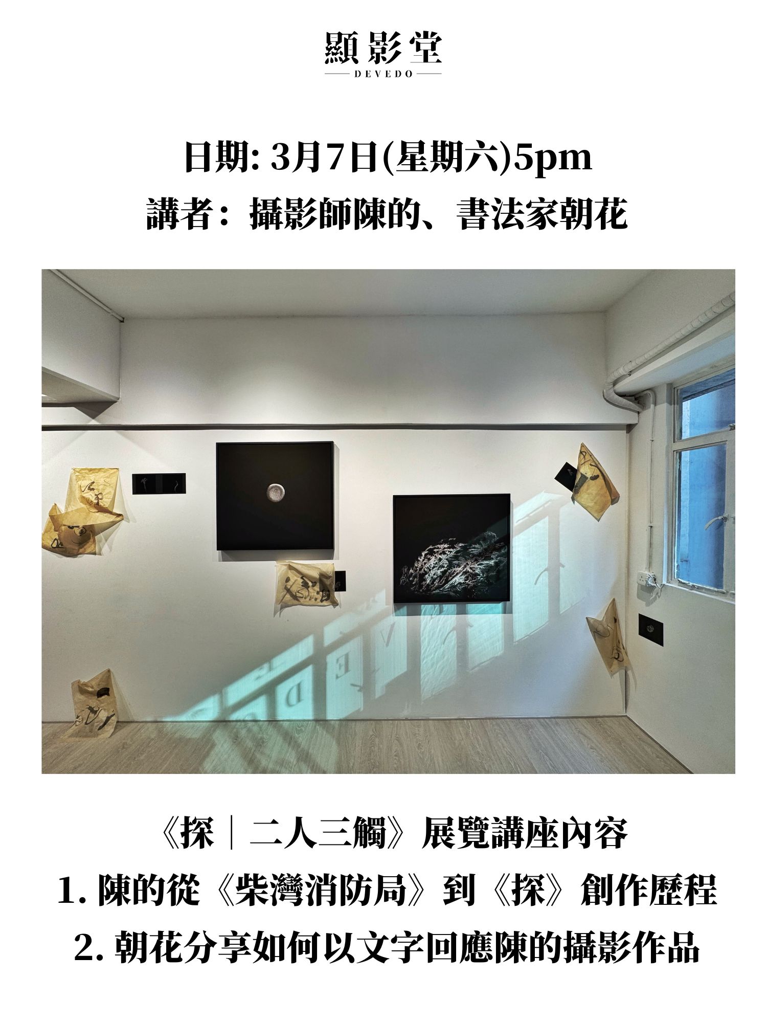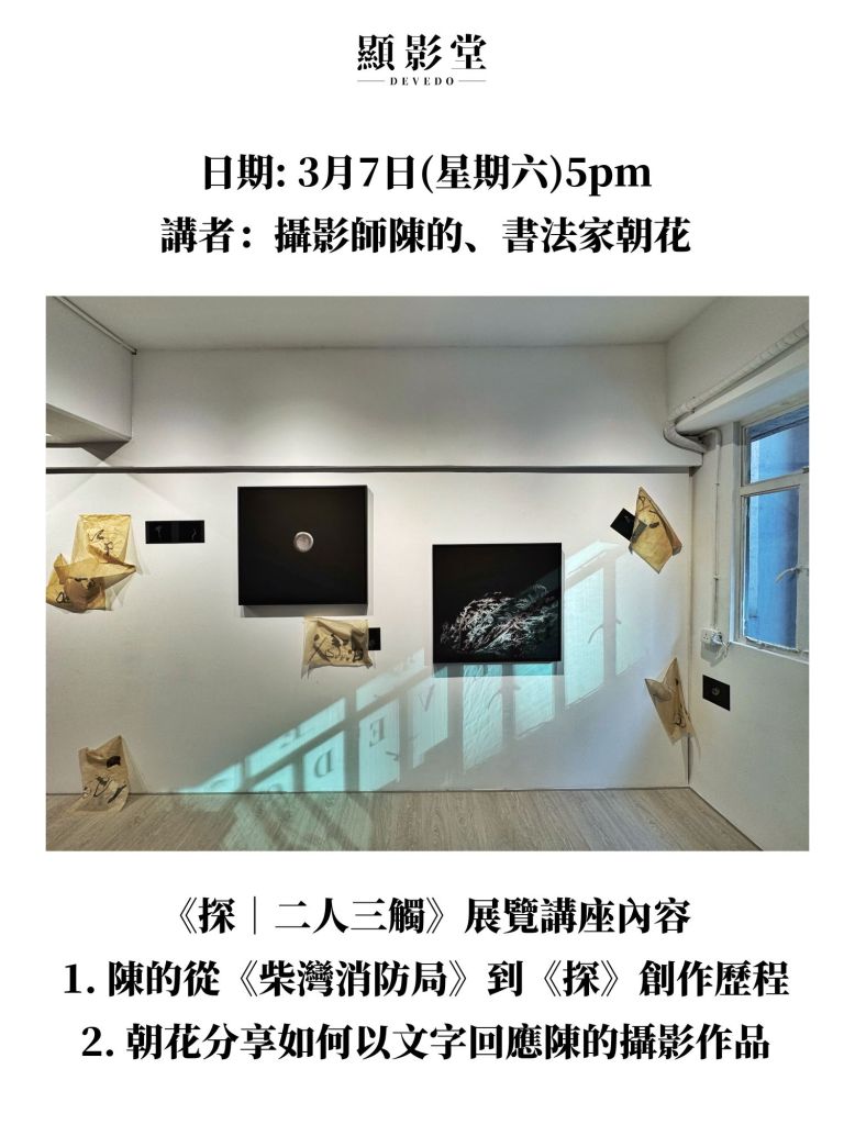 為令觀眾更好地了解兩位藝術家的作品及展覽構思,顯影堂特意舉辦講座,邀請攝影師陳的分享從《柴灣消防局》到《探》的創作歷程,而書法家朝花則會講解如何以文字回應陳的攝影作品。