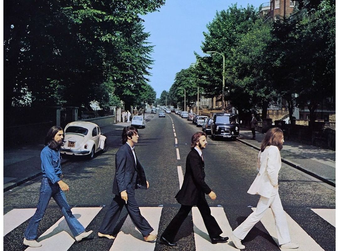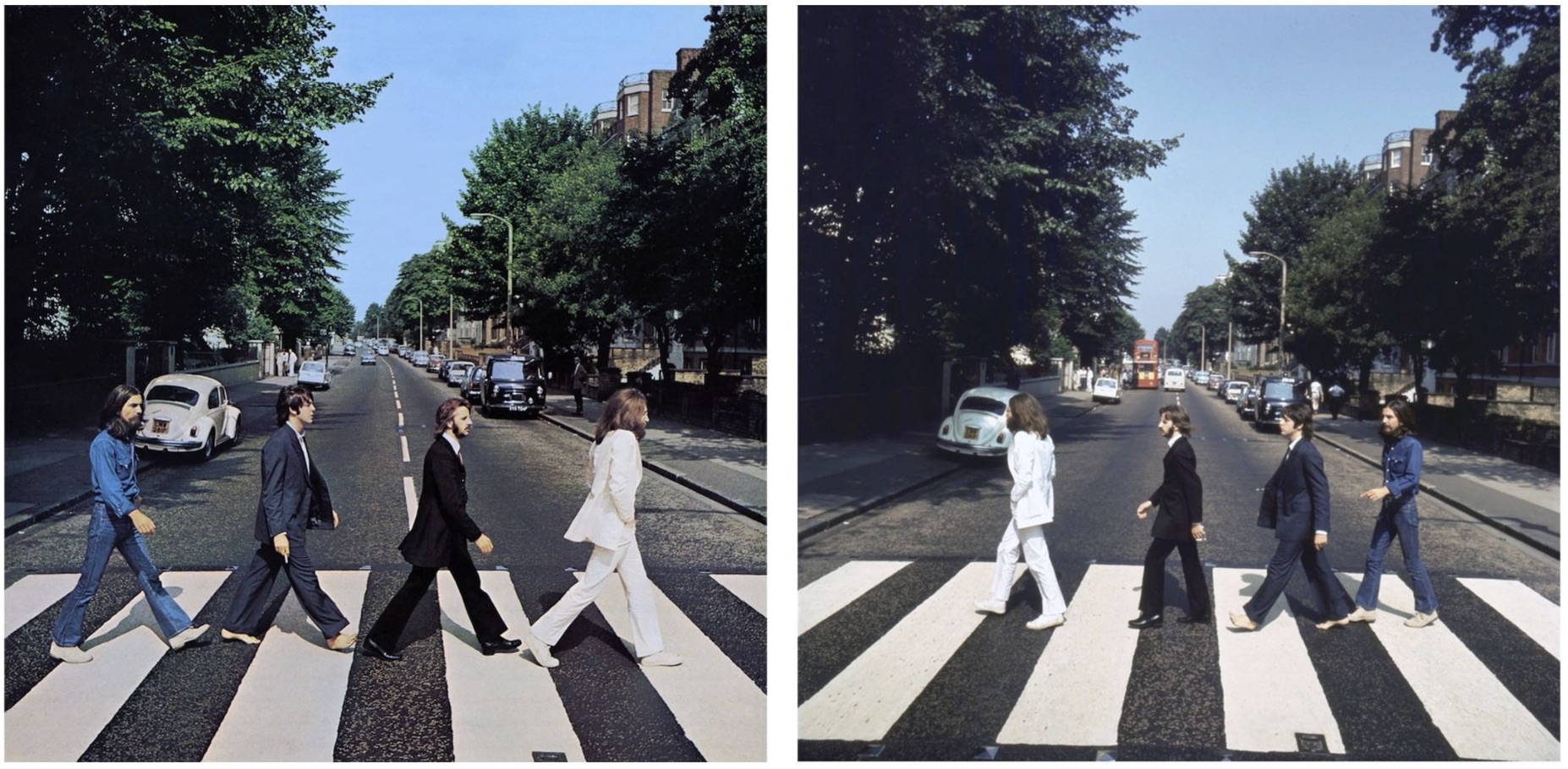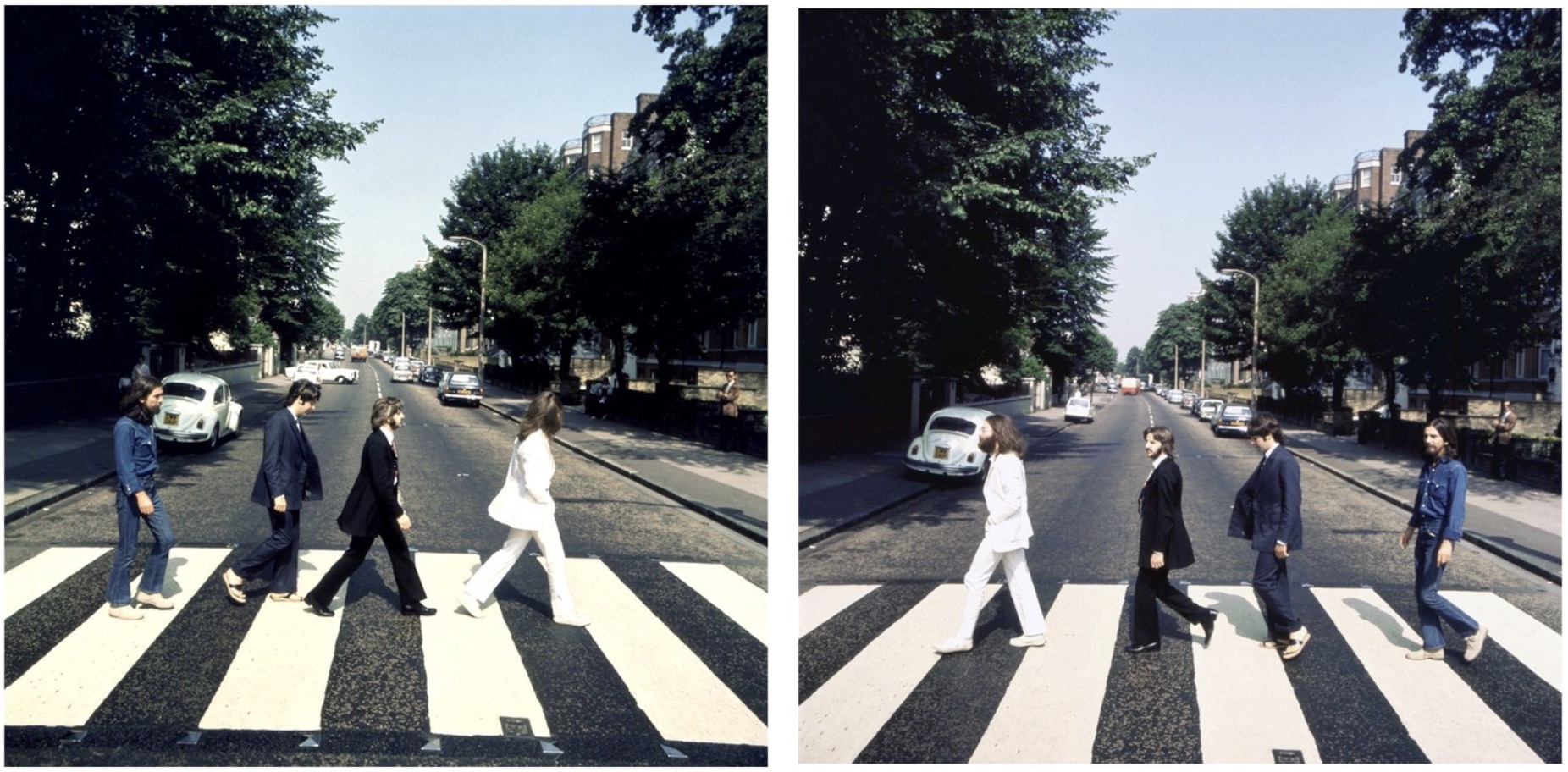 John Lennon、Ringo Starr、 Paul McCartney及George Harrison四人往斑馬線左右兩個方向分別走過三次,最初兩張照片裏的Paul McCartney穿著涼鞋,第三、第四張相片後面的紅色巴士太搶眼,其他的照片也總會出現行人,或者步伐不一致,最終他們選擇動作一致的第五張照片,作為第十一張專輯的封面,在這張照片中,赤腳的Paul手中正拿著香煙。