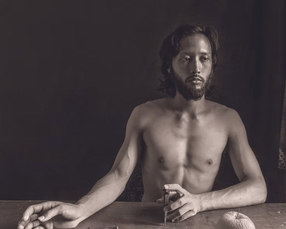 他將位於台北士林的教堂化作一座靜謐的藝術殿堂,一處既可禱告也可創作的精神空間。在那裡,他重新拿起放下多年的相機,創作出名為《微塵聖像》的系列作品——以聖經為靈感,亞當的孤寂、諾亞的等待,還有該隱、亞伯、以撒⋯⋯那些耳熟能詳的聖經故事,被他以身邊的弟兄姊妹重新演繹,這不是神話的重現,而是對人之存在與靈魂的凝視。