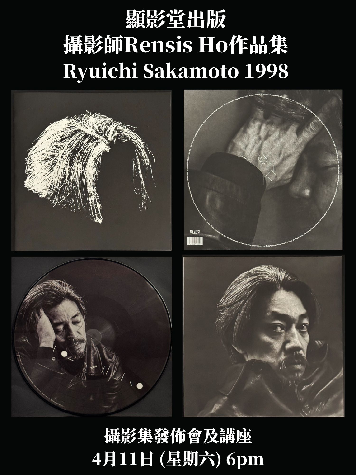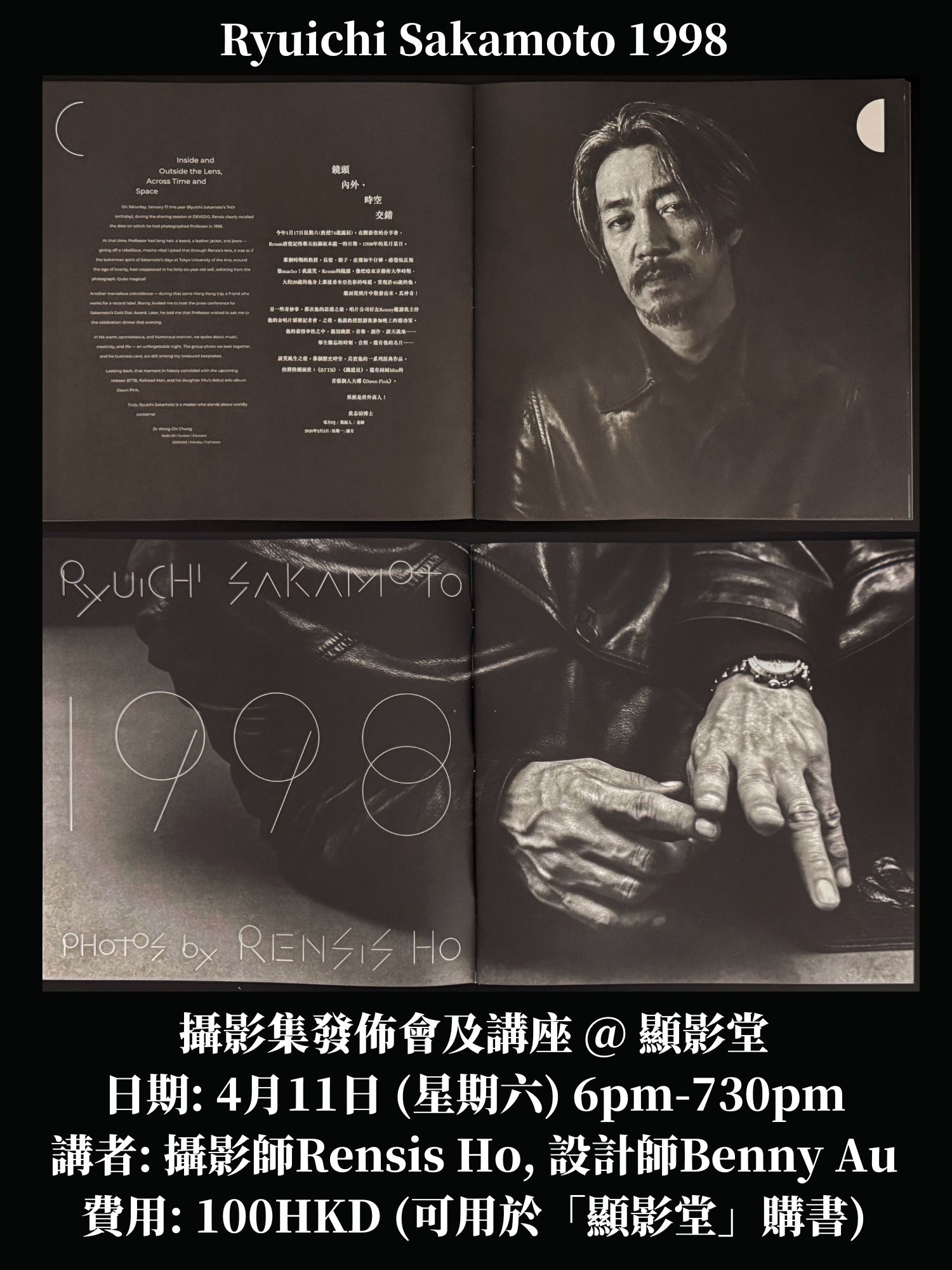 香港攝影師Rensis Ho拍攝日本音樂巨匠坂本龍一肖像的作品集《Ryuichi Sakamoto 1998》即將面世,攝影集由香港攝影書店「顯影堂」出版,將於4月11日舉辦新書發佈會及講座,邀請攝影師重溫1998年拍攝教授的往事,以及邀來著名設計師Benny Au分享作品集的構思及設計理念。
