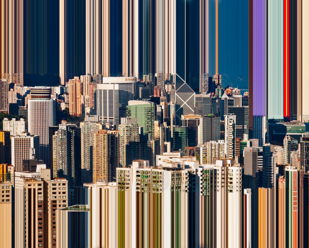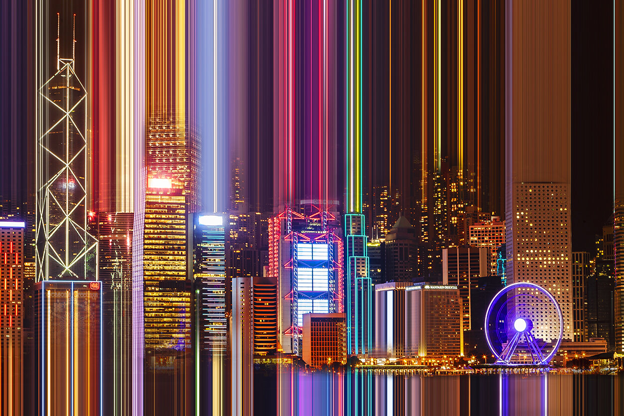 例如作品《Bright Line Rules》中呈現的中環景色,影像經過處理之後,恍如長時間曝光的車軌夜景,彷彿置身cyberpunk時空。同樣是中環夜景,另一幅作品《Reading Between The Lines》則把照片變成色彩繽紛的線條與色塊,宛如一幅抽象畫作。相片中的夜景早已變得面目全非,然而在色彩的迷霧中似乎仍浮現着城市景觀,讓人好奇畫面中的真實夜色究竟是甚麼模樣。